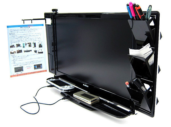 Thanko представила удобную навесную полку, крепящуюся к вашему ЖК-монитору со всех сторон и имеющую не только несколько удобных «задвижных» полочек, но и встроенный четырехпортовый USB-хаб (ну это же Thanko все-таки). Полочки удобны для распределения по ним как всяческих карандашей, так и кабелей, конфеток, флешек, отверток, мобильников, карт памяти, ножниц, наушников от плеера и прочей всячины.